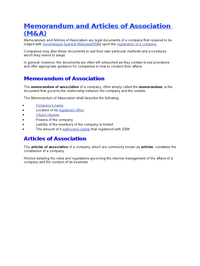 Related : Memorandum And Articles Of Association Malaysia / It is a document that is essential at the time of incorporation of the company and can be referred to in future also..