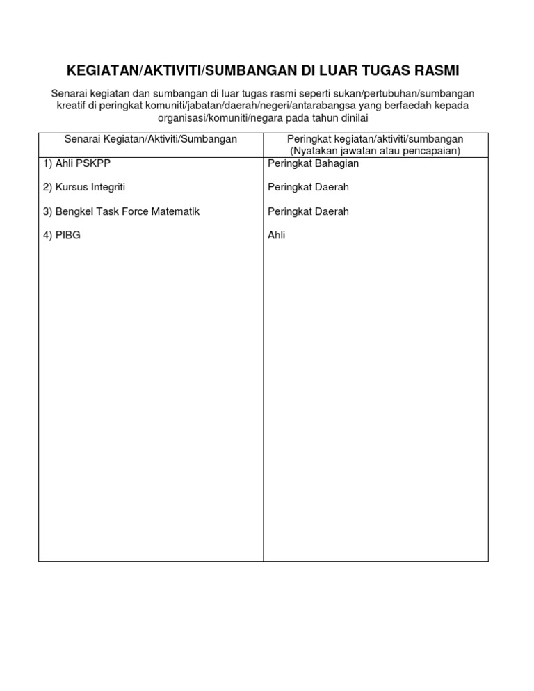 Related : Kegiatan Dan Sumbangan Di Luar Tugas Rasmi - Kegiatan dan sumbangan di luar tugas rasmi peringkat antarabangsa / kebangsaan / negeri / daerah / jabatan / komuniti (maksimum 10 markah ).